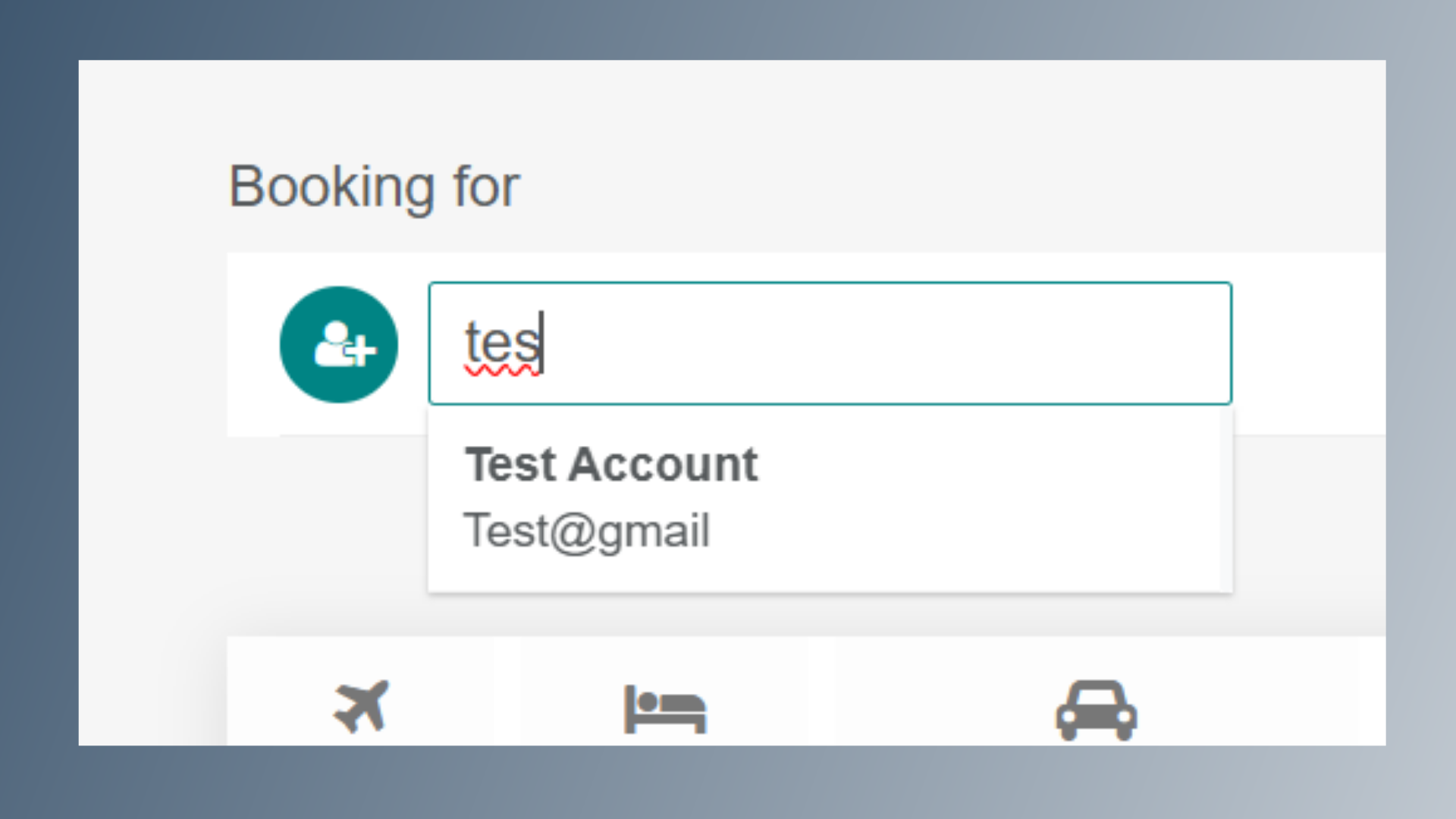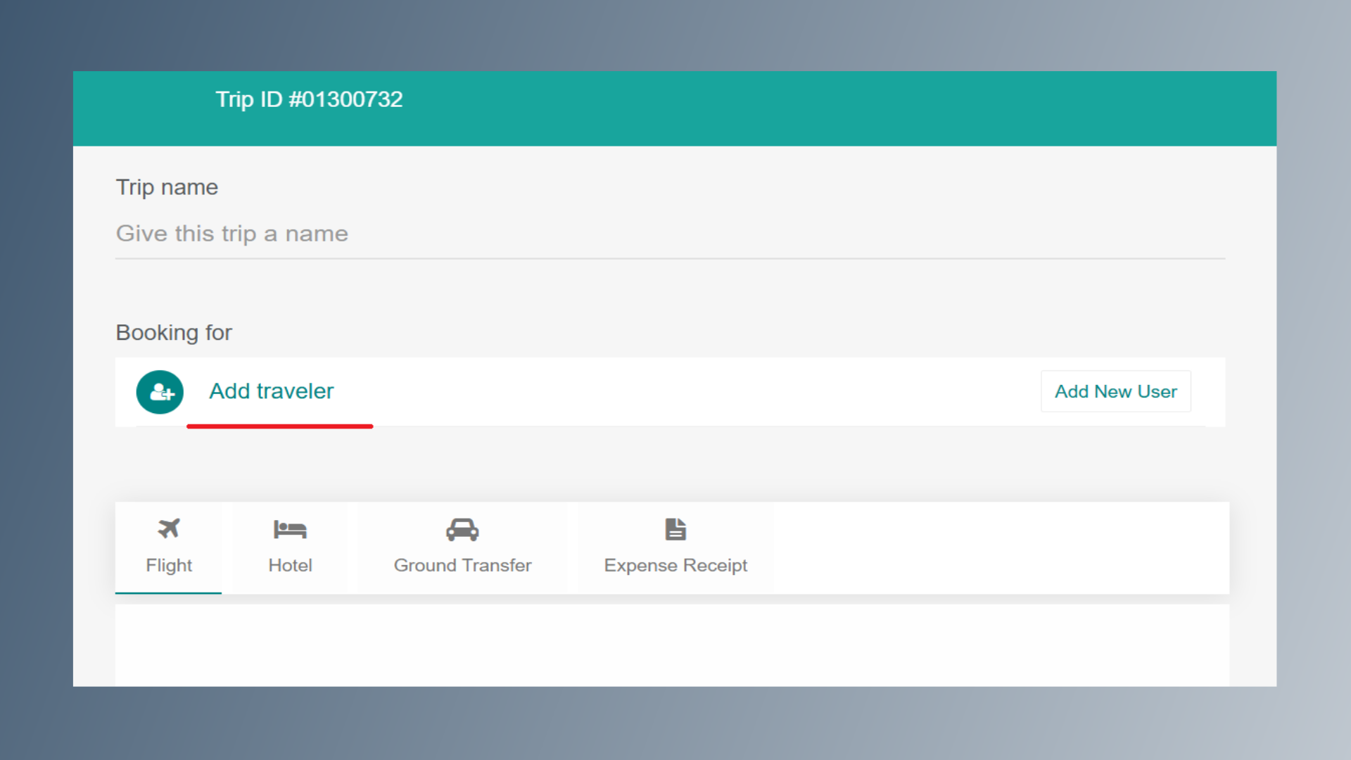 Click on Add Traveler. Start typing the employee’s name. A dropdown list will appear under the Booking For option. Select the correct employee name from the list.