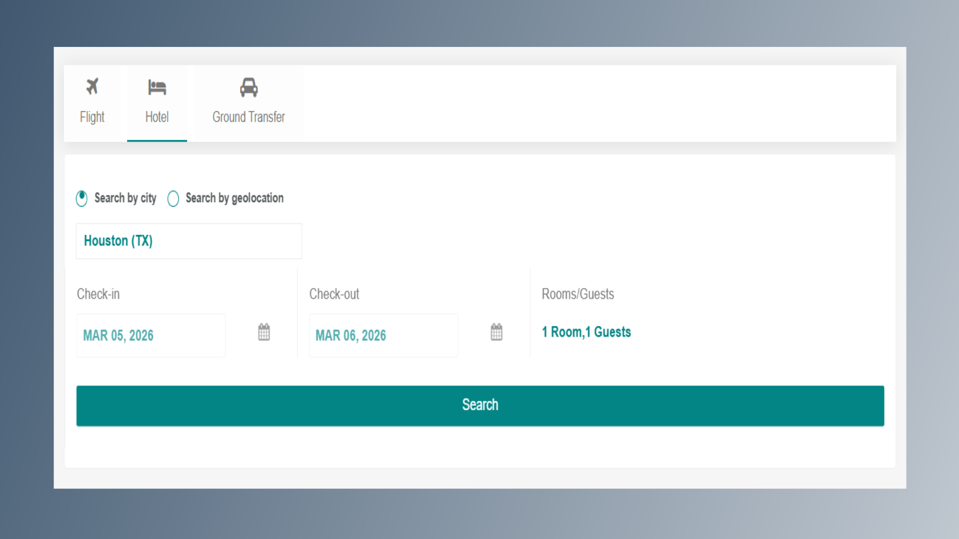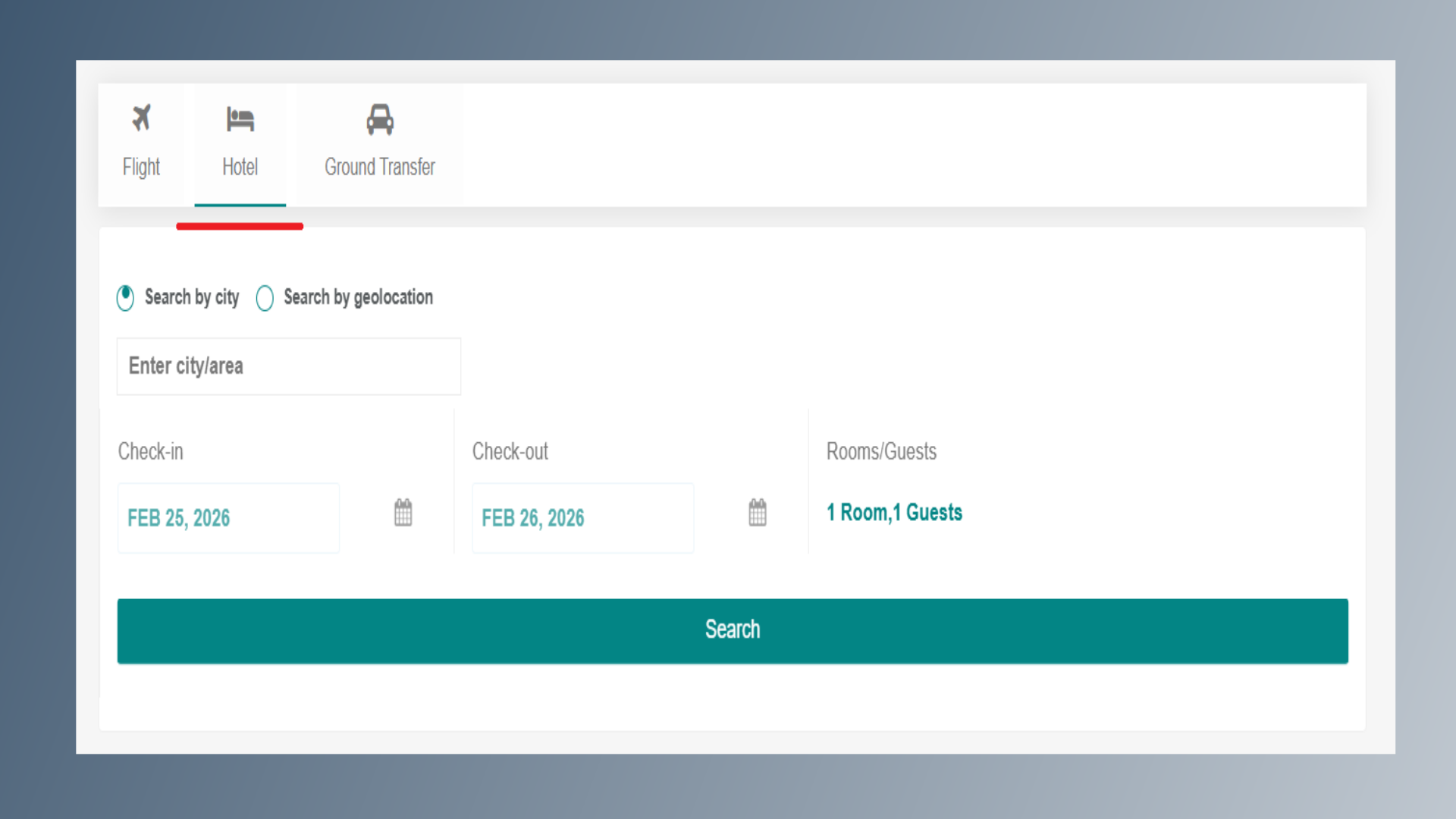 You will see two search options: Search by City or Search by Geolocation Select the option that is most suitable. Enter Search Details. Enter the Location (city or geolocation). Select the Check-in and Check-out dates as per the travel plan. Choose the number of rooms and guests. Click on the Search button.