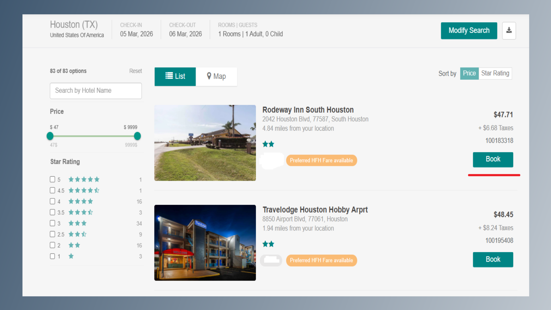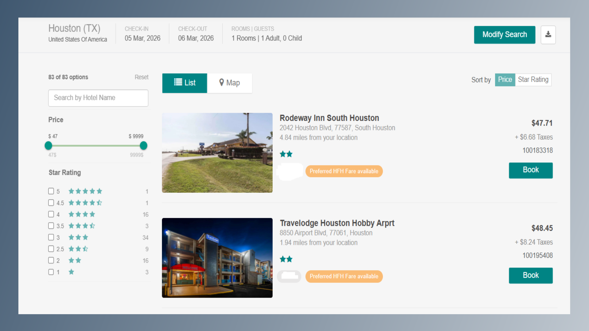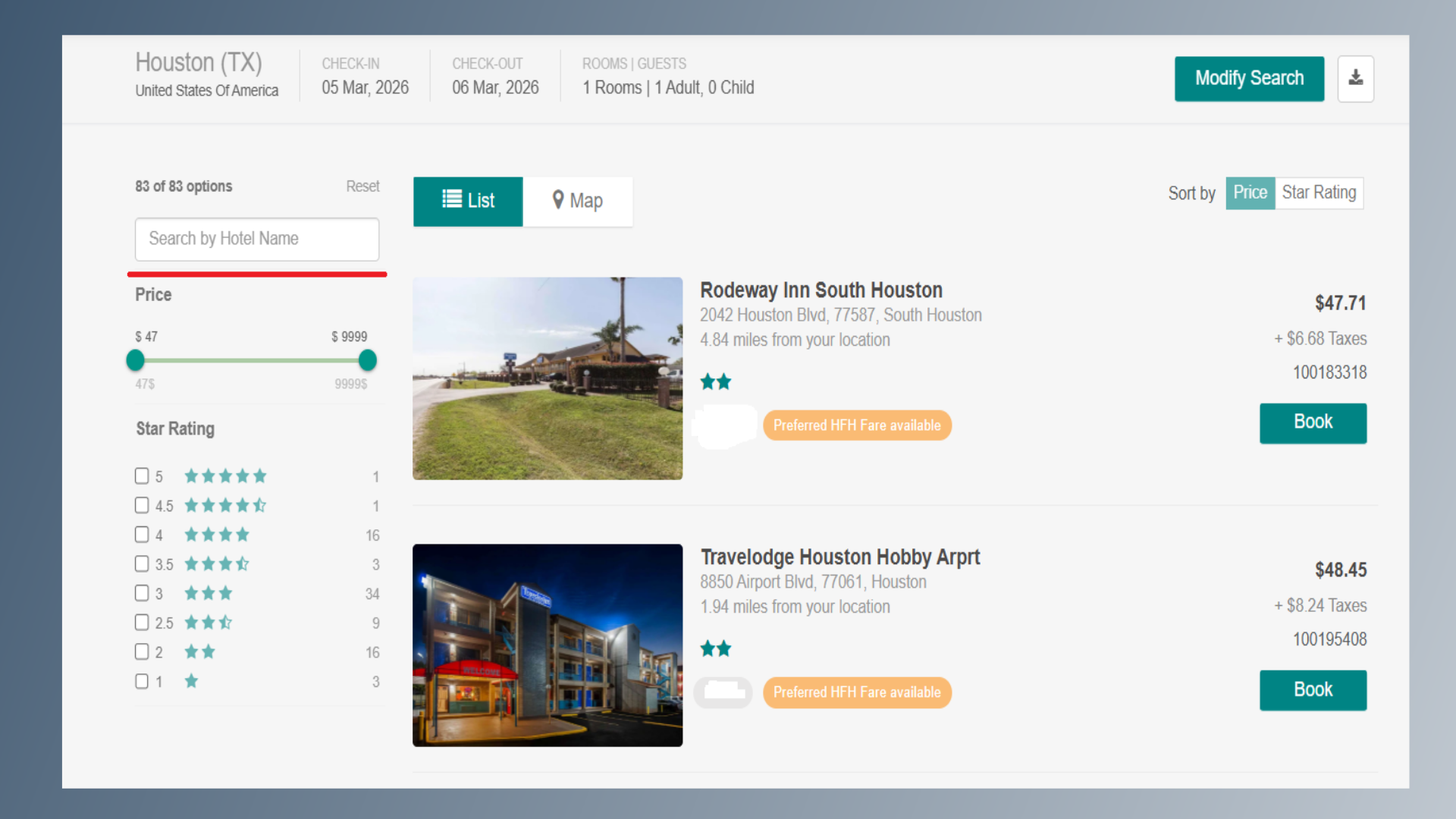 Choose a property from the displayed results, or If searching for a specific hotel, enter the property name under “Search by Hotel Name.”