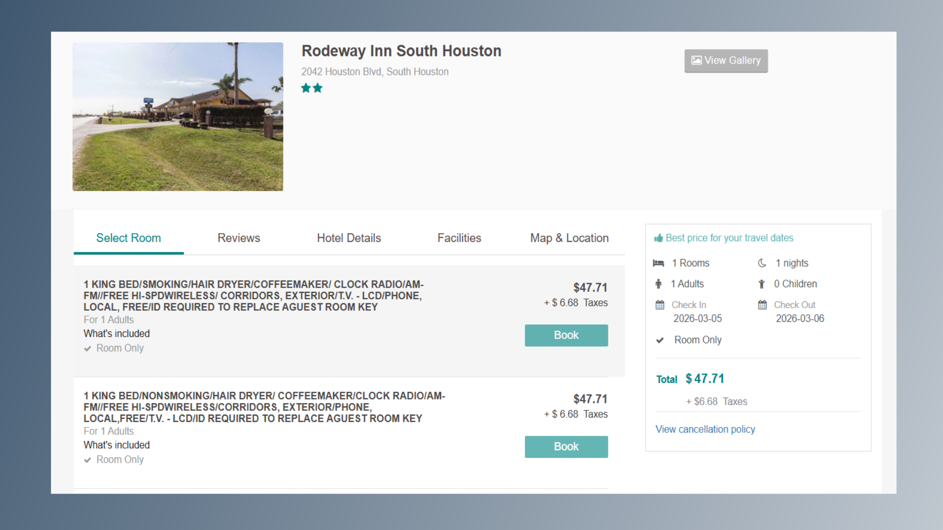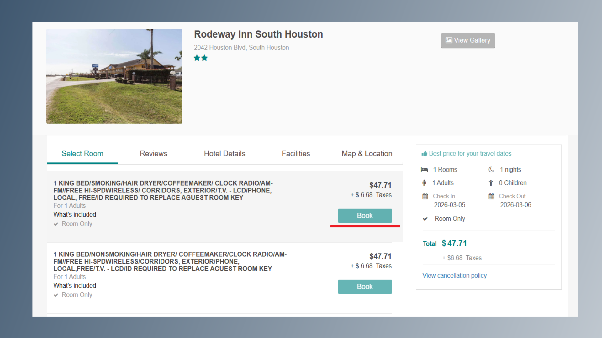 After that, click on the desired room type to view the total price, taxes, and cancellation policy.